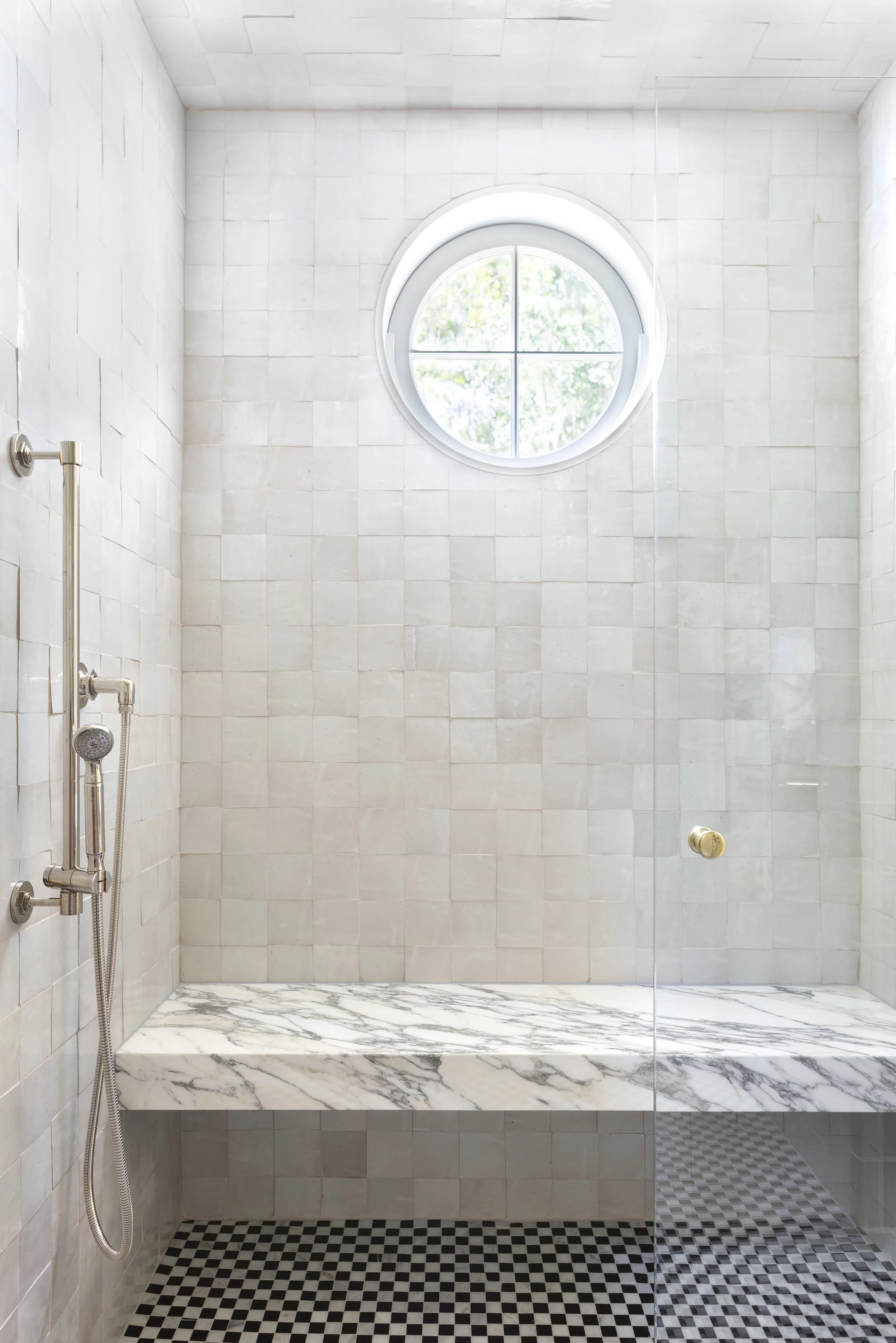 The bathroom, divided into separate his and her spaces, was opened up and grounded by a free-standing tub affront a new floor to ceiling window, adorned with linen drapes. Flanking the tub are two custom vanities, featuring marble and nickel fittings. Custom floor tiles and antiques add depth and provide both beauty and function. The utility room offers a more simple approach, with flat panel cabinetry, a large apron front farm sink, and perfectly aged original brick floors.